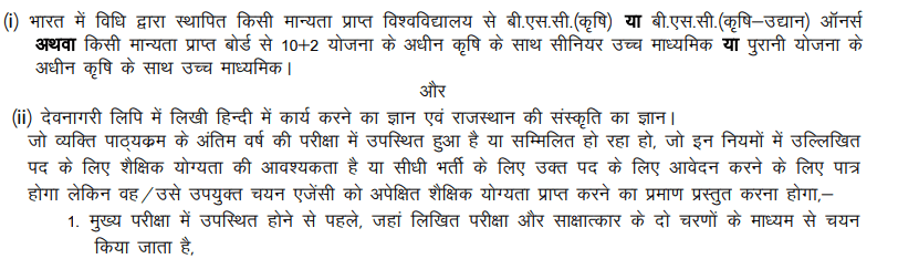 Subject Questions Answers General Hindi 15 45 Rajasthan GK (History & Culture) 25 75 agronomy (शस्य विज्ञान) 20 60 udyaniki (उद्यानिकी) 20 60 Animal husbandry (पशुपालन) 20 60 Total 100 300